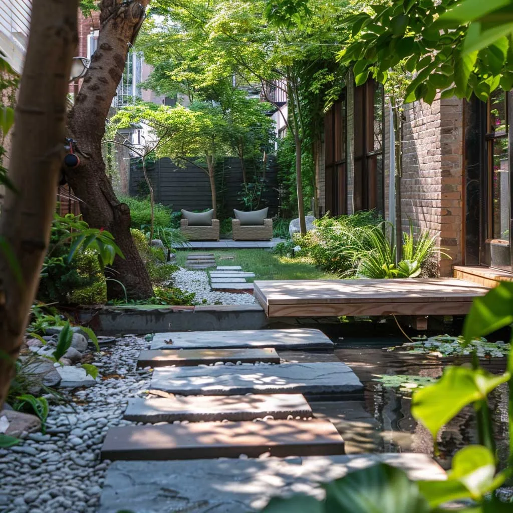 Cảnh quan cứng, bao gồm lối đi và sân hiên làm từ bê tông mài hoặc đá tự nhiên, tạo nên cấu trúc và dẫn hướng chuyển động trong vườn. Việc kết hợp cây cảnh điêu khắc vào một khu vườn tối giản đòi hỏi một cách tiếp cận chu đáo trong việc lựa chọn và bố trí.