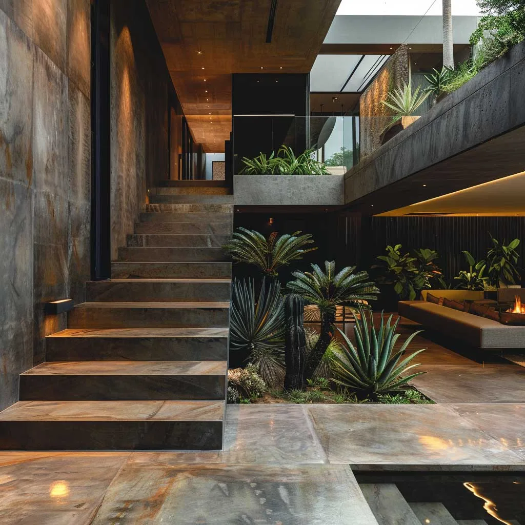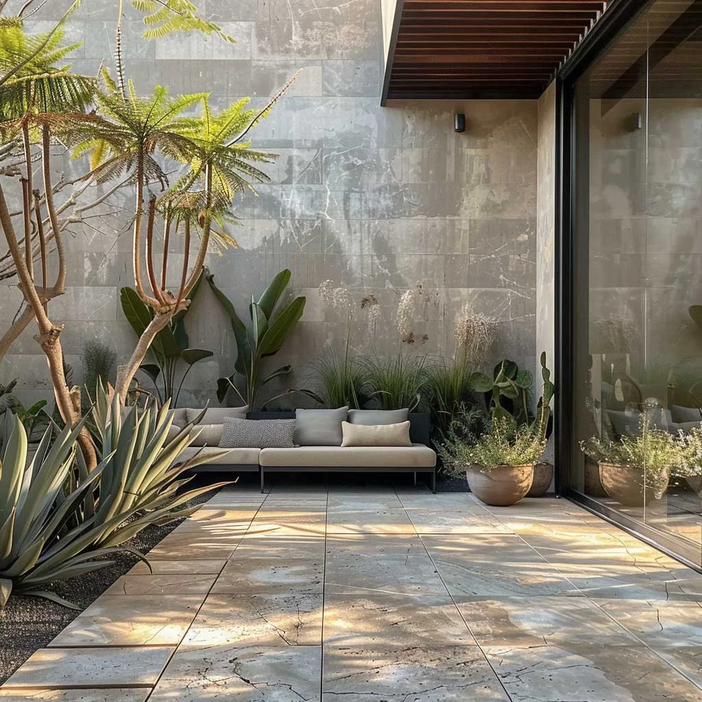 Cảnh quan cứng, bao gồm lối đi và sân hiên làm từ bê tông mài hoặc đá tự nhiên, tạo nên cấu trúc và dẫn hướng chuyển động trong vườn. Việc kết hợp cây cảnh điêu khắc vào một khu vườn tối giản đòi hỏi một cách tiếp cận chu đáo trong việc lựa chọn và bố trí.