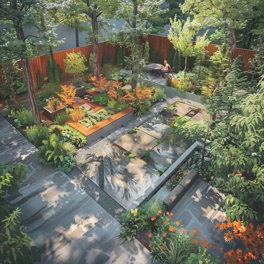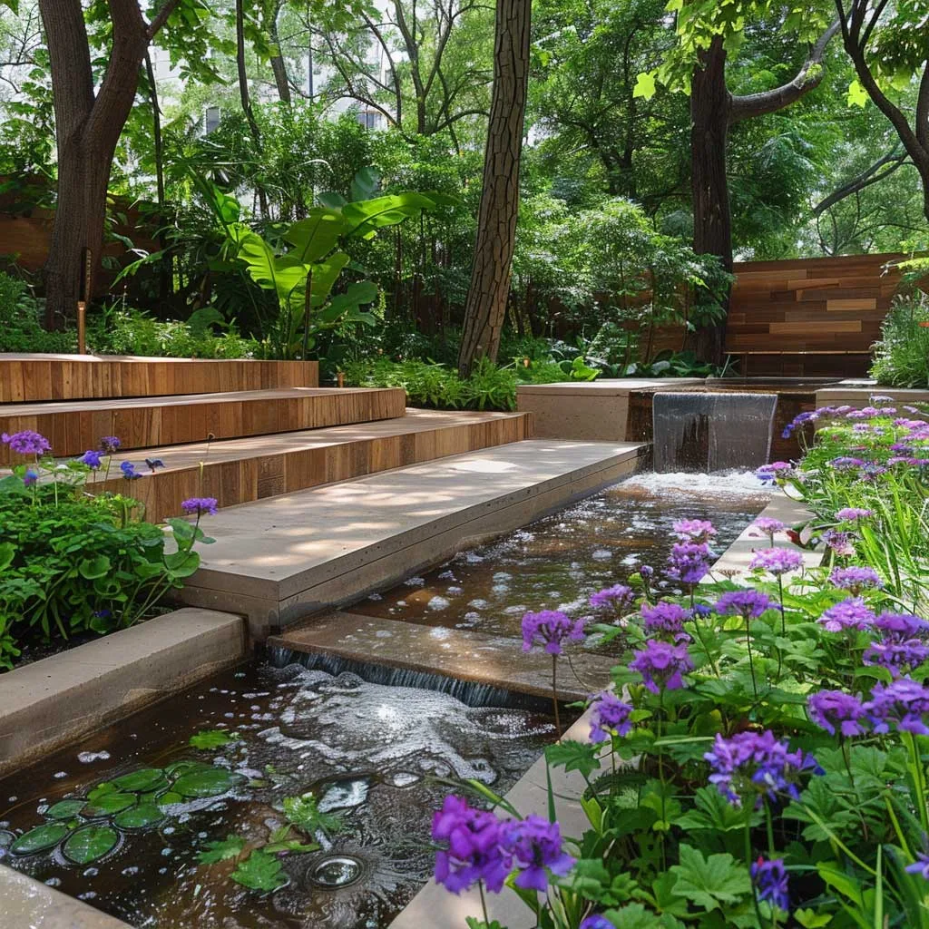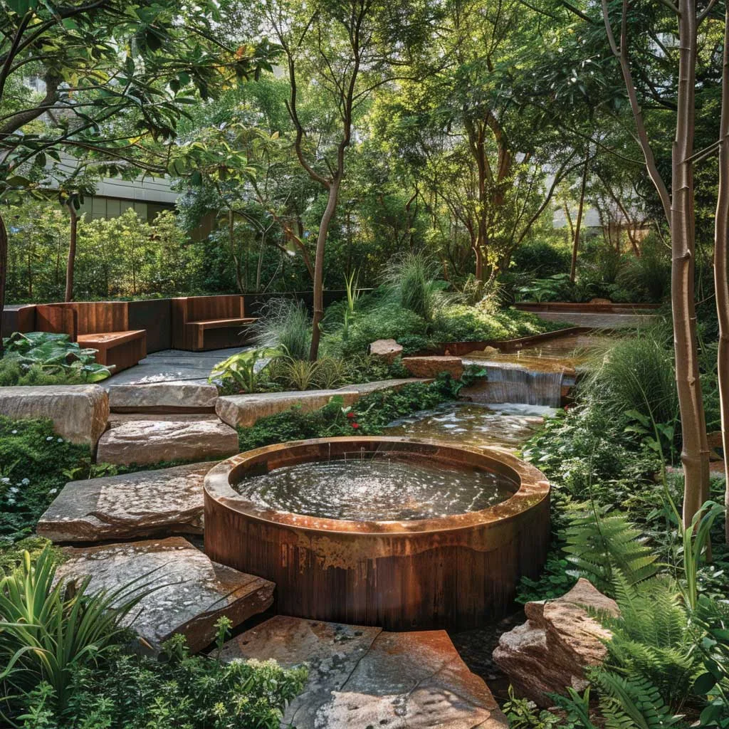Tính bền vững không chỉ nằm ở việc lựa chọn cây trồng mà còn ở vật liệu và quy trình sử dụng trong vườn. Khu vực ghế ngồi được bố trí xen kẽ giữa những mảng xanh, mang đến không gian nghỉ ngơi và suy ngẫm, được bao quanh bởi âm thanh của thiên nhiên và tiếng nước chảy nhẹ nhàng.