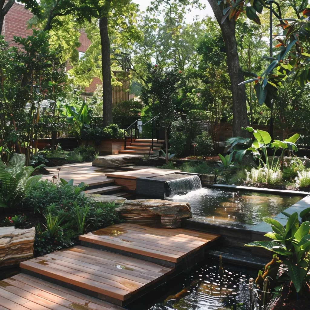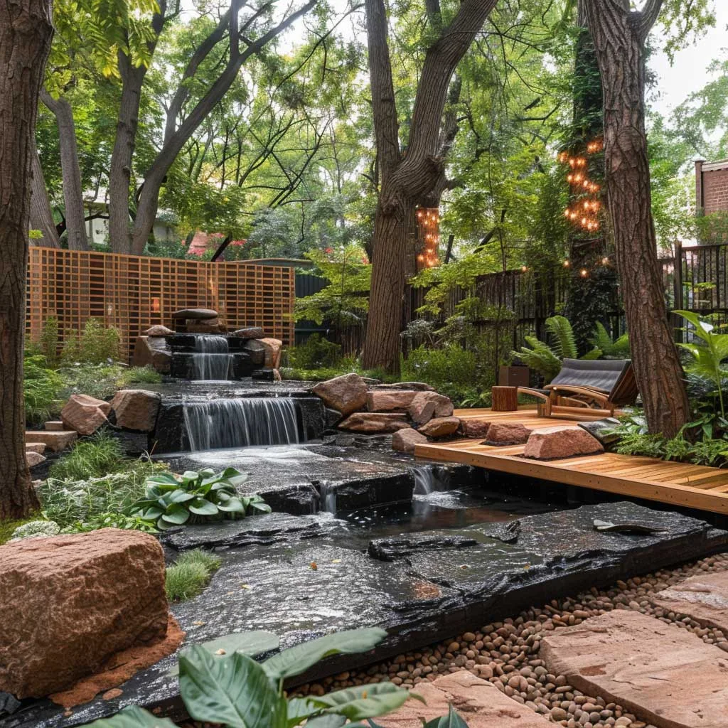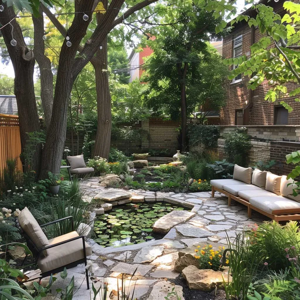 Tính bền vững không chỉ nằm ở việc lựa chọn cây trồng mà còn ở vật liệu và quy trình sử dụng trong vườn. Khu vực ghế ngồi được bố trí xen kẽ giữa những mảng xanh, mang đến không gian nghỉ ngơi và suy ngẫm, được bao quanh bởi âm thanh của thiên nhiên và tiếng nước chảy nhẹ nhàng.