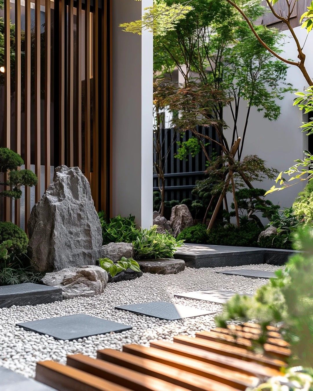 Làm mới lối đi: Thay thế những mảng gạch cũ bằng đá tự nhiên uốn lượn, đan xen cùng sỏi mịn để mỗi bước chân đều trở nên nhẹ nhàng hơn.