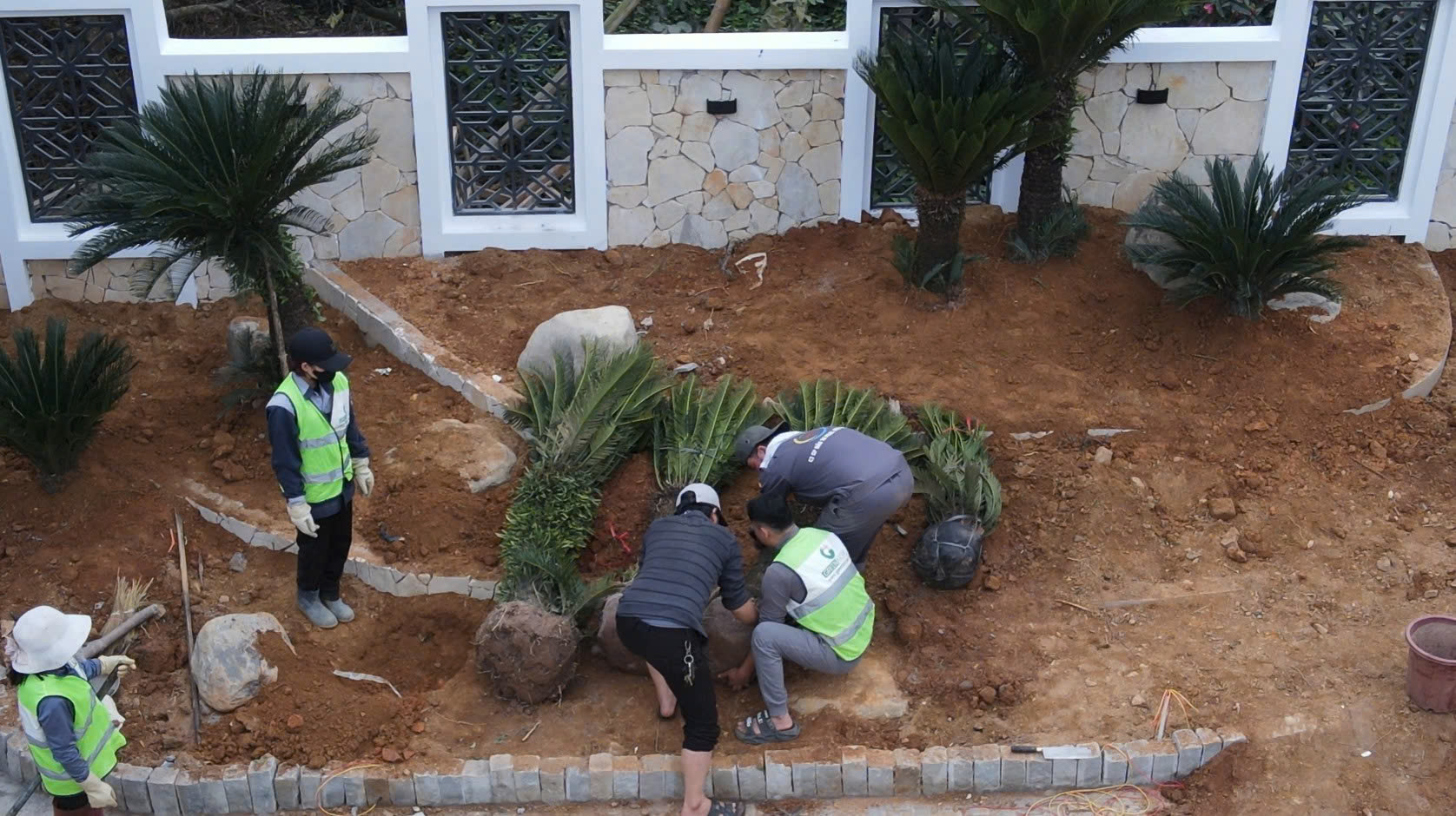 Kỹ thuật: Trước khi hạ bầu, các kỹ sư sẽ định vị hướng nắng và góc nhìn chính từ ngôi nhà để xoay cây sao cho thẩm mỹ nhất. Bầu cây được giữ nguyên lớp lưới bọc hoặc xử lý khéo léo để không làm đứt rễ tơ – “hệ tuần hoàn” chính của cây.