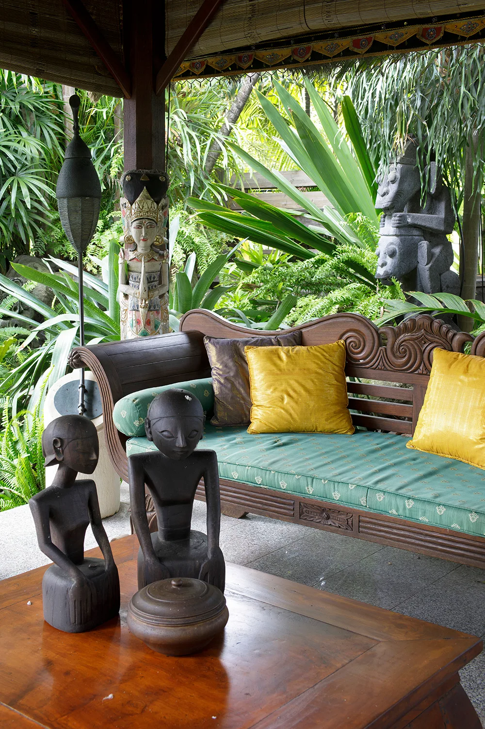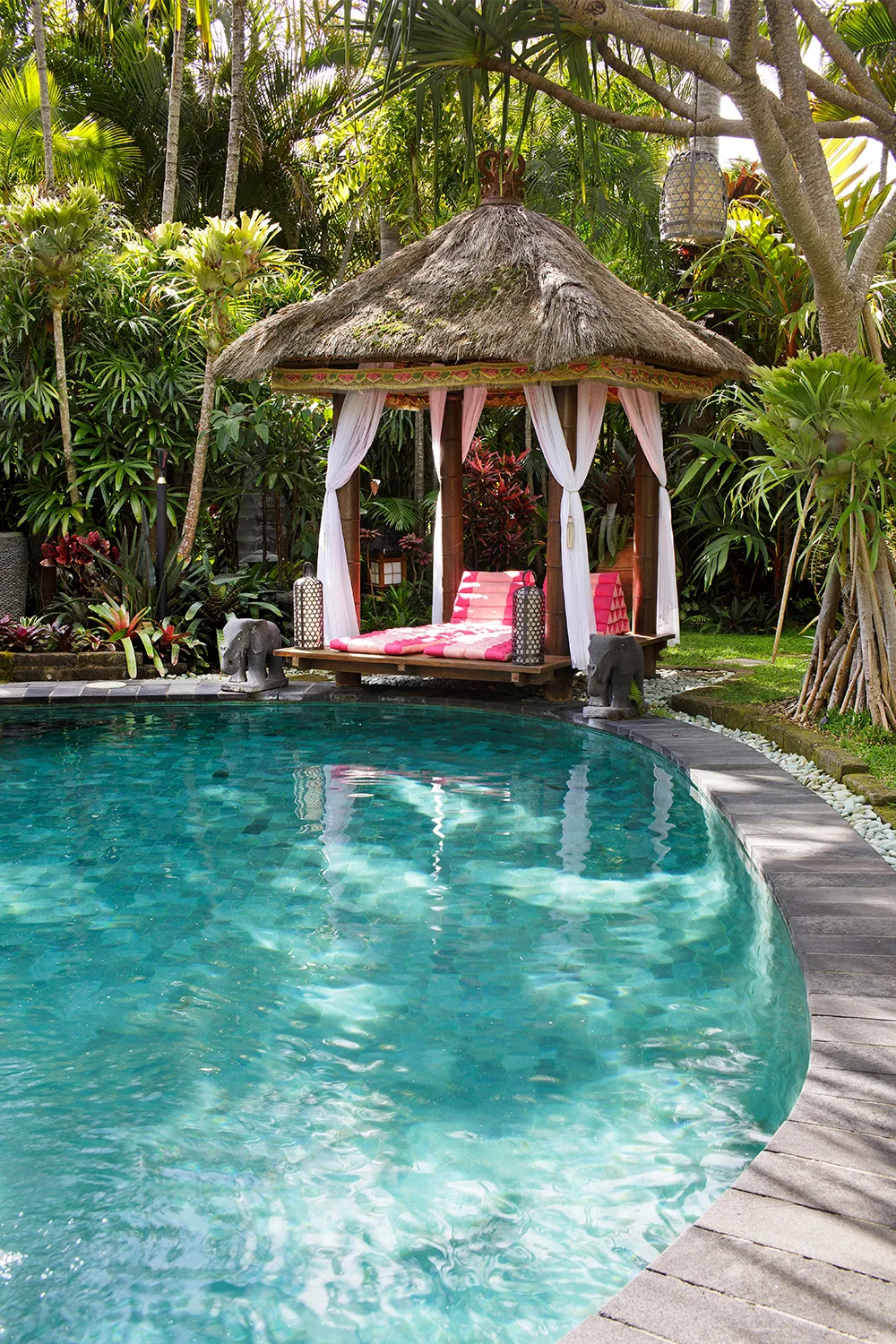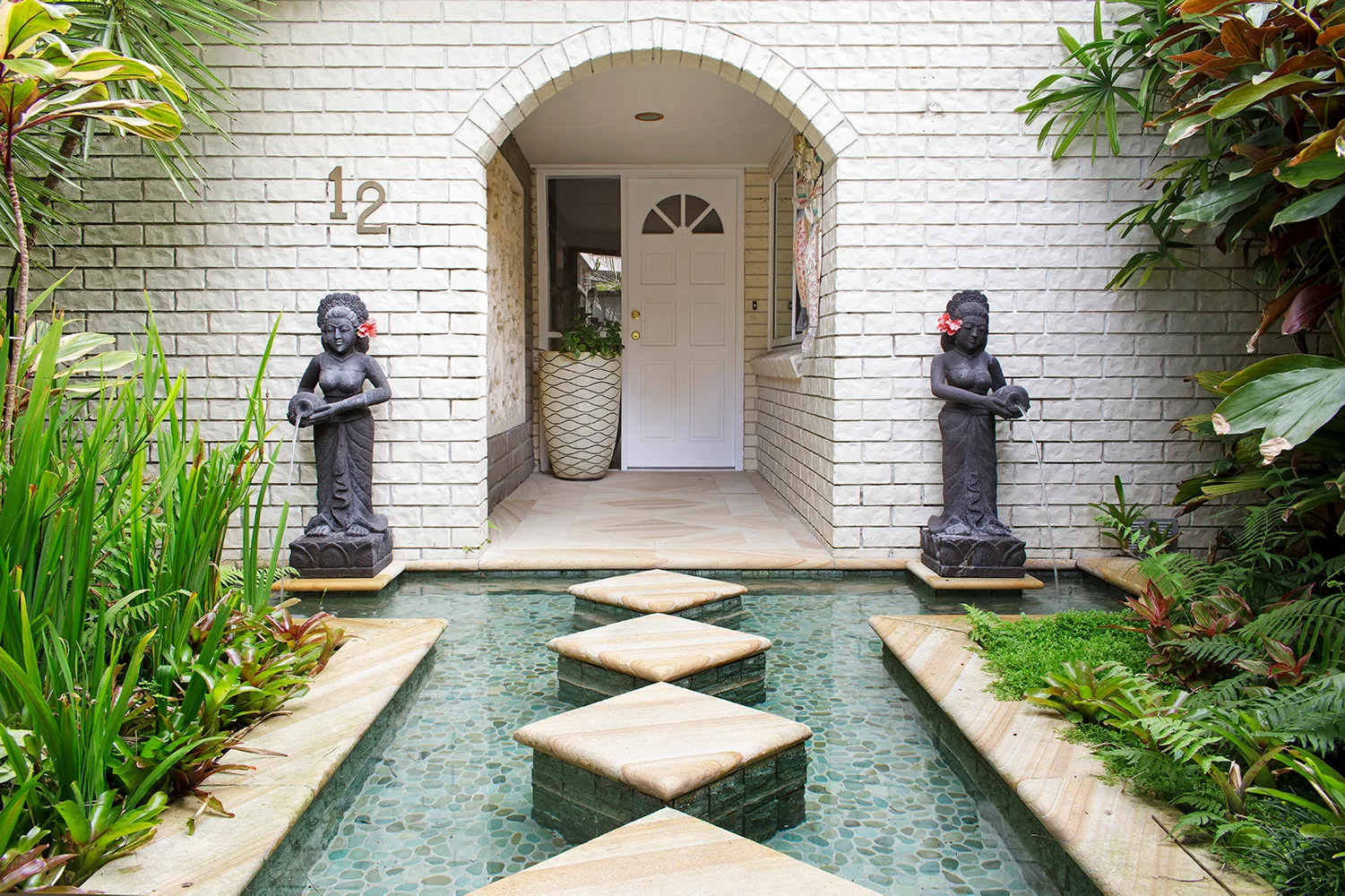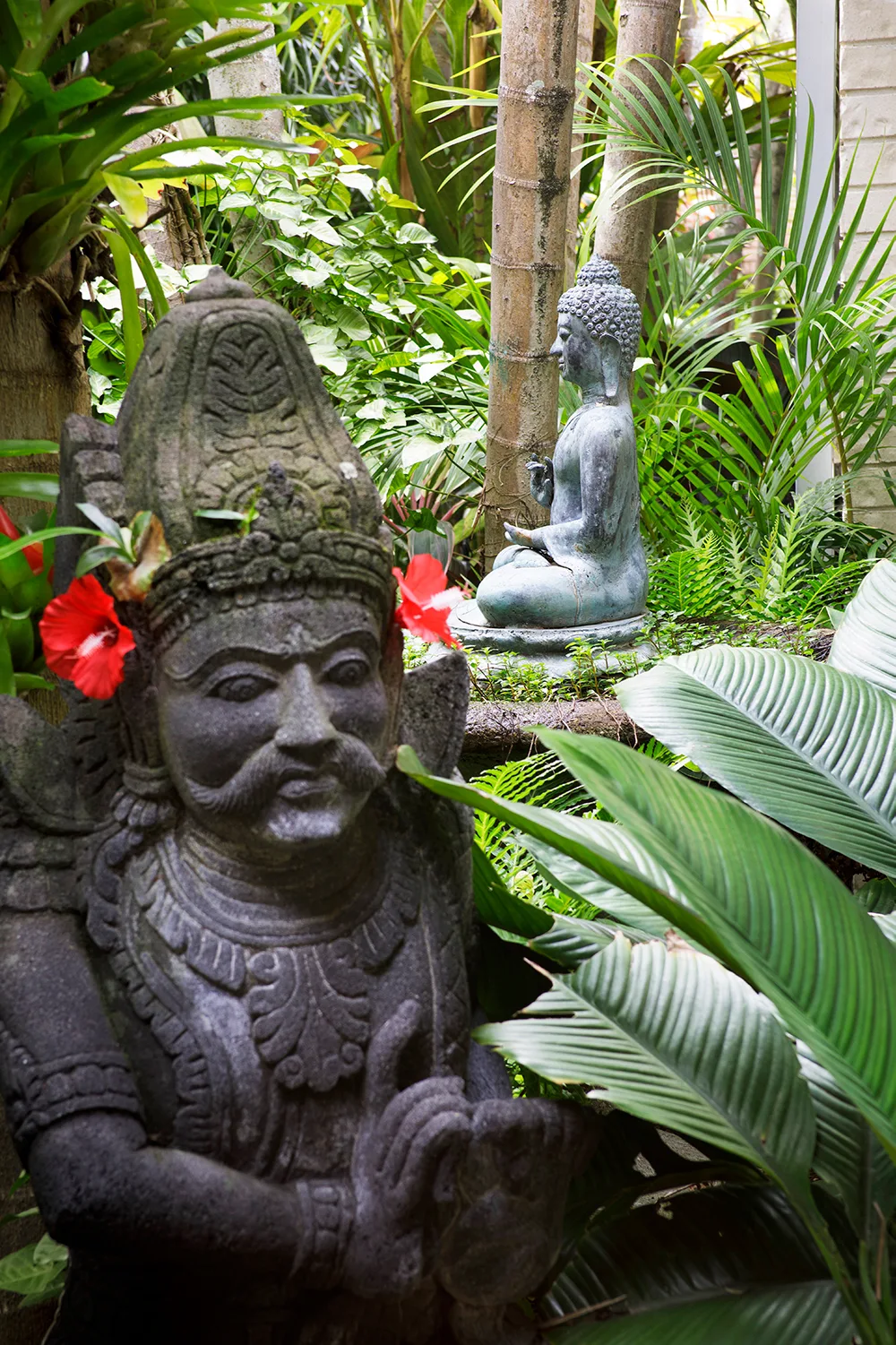 - Các đặc điểm về nước rất quan trọng trong các khu vườn nhiệt đới, có thể là hồ bơi, ao, thác nước trên tường hoặc đài phun nước trong chậu.