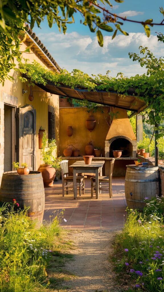 Vườn Địa Trung Hải ưu tiên sử dụng vật liệu tự nhiên như đá, gạch nung và gỗ, tạo cảm giác mộc mạc, ấm áp và chân thực.