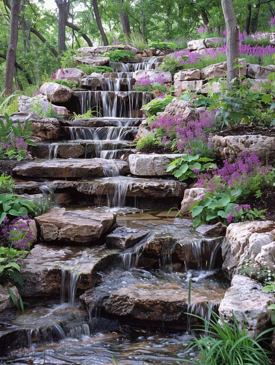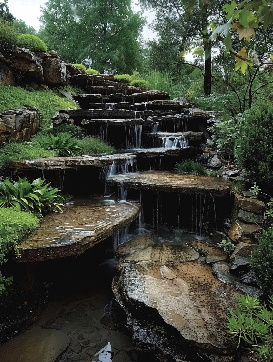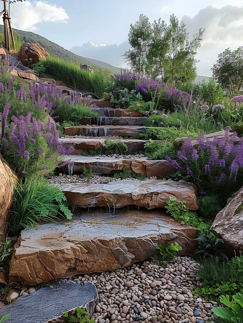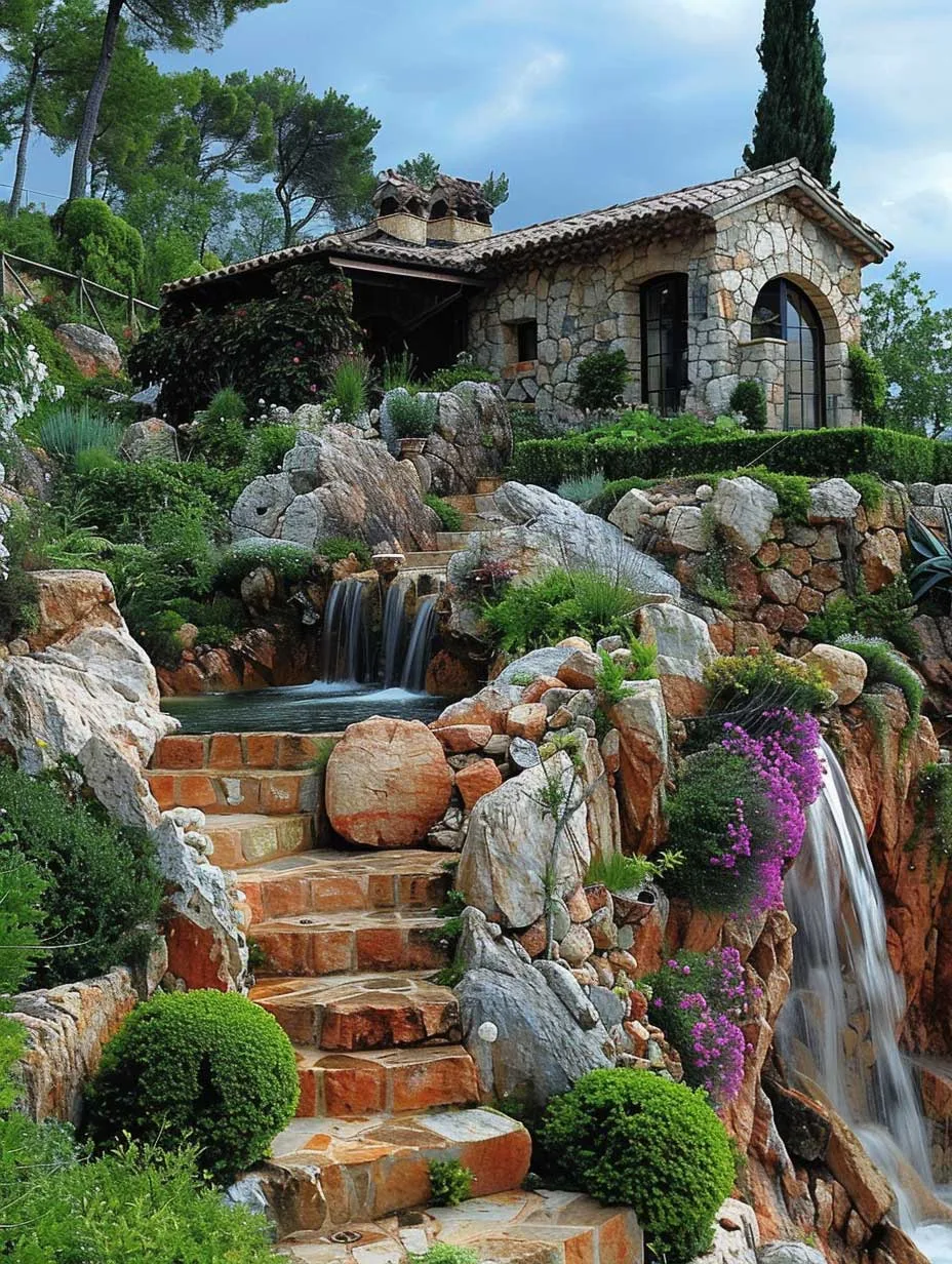 Khu vườn sườn đồi đá với thác nước nhỏ đổ xuống