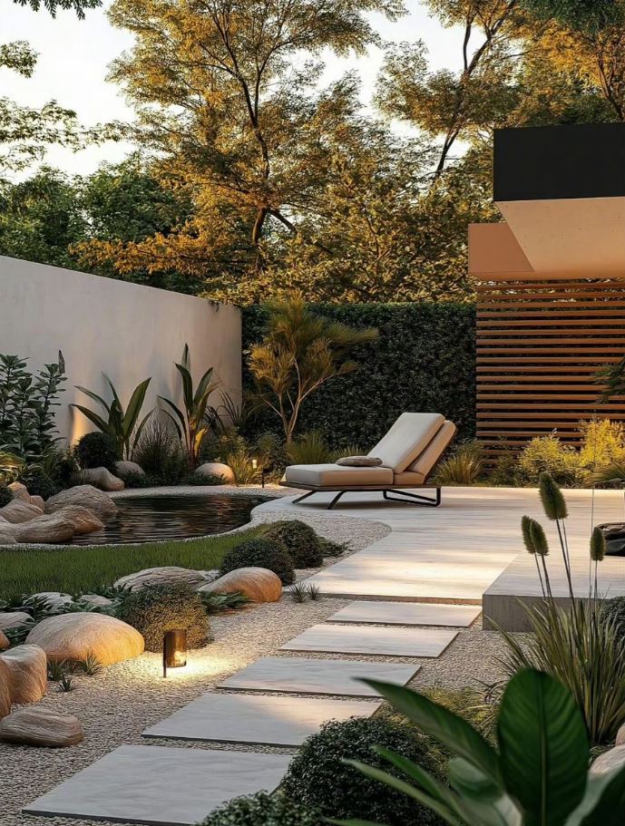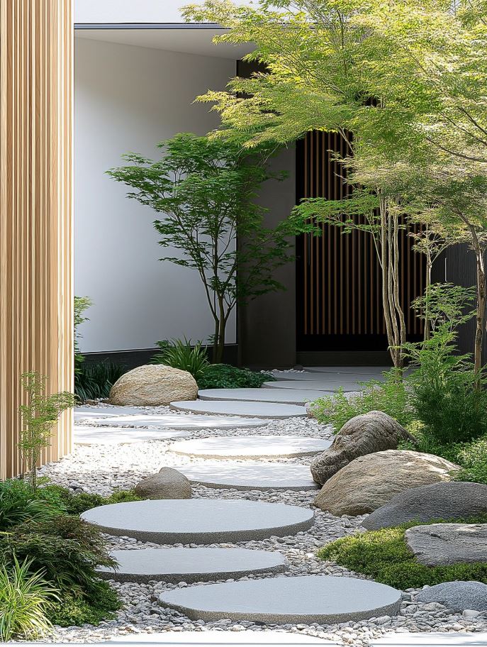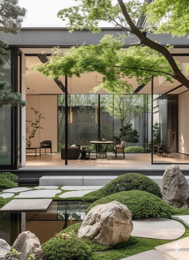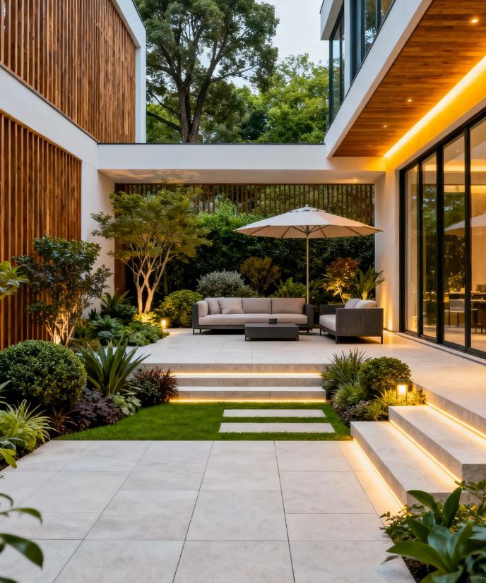 - Sân vườn trước nhà không cần quá cầu kỳ, nhưng cần sự tinh tế. Đó có thể là một thảm cỏ xanh mướt trải dài, một vài khóm hoa rực rỡ nép mình bên bậc thềm, hay một lối đi bằng đá tự nhiên dẫn dắt lối về.