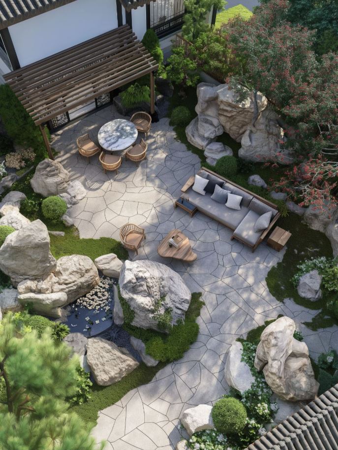 Những yếu tố như một hồ nước nhỏ hoặc thác nước mini phía trước còn là biểu tượng của sự luân chuyển tiền tài và may mắn.