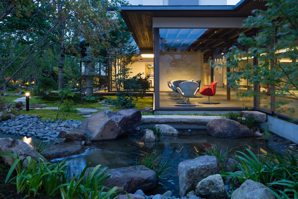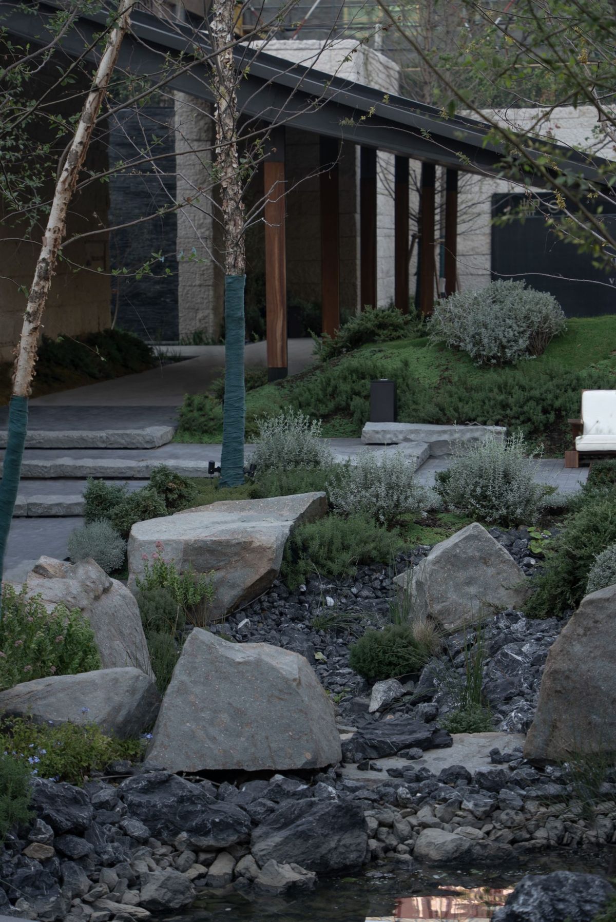 Dòng suối được thiết kế với độ dốc và vật liệu đá phù hợp, tạo ra âm thanh êm ái, nhẹ nhàng.