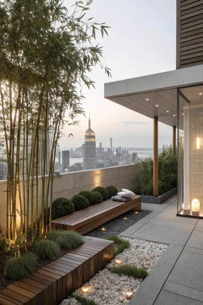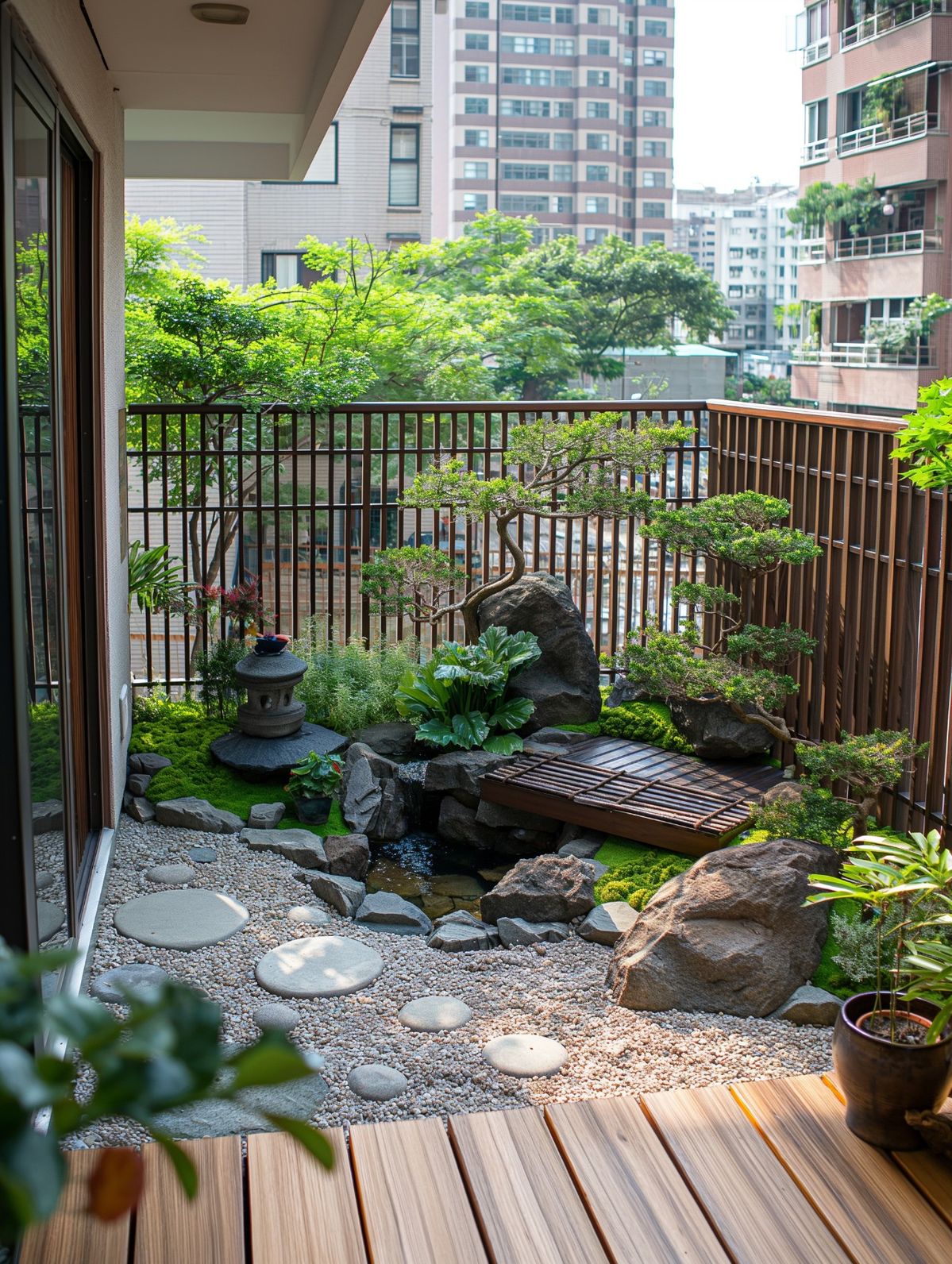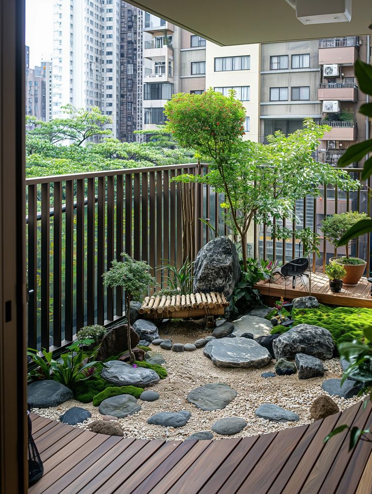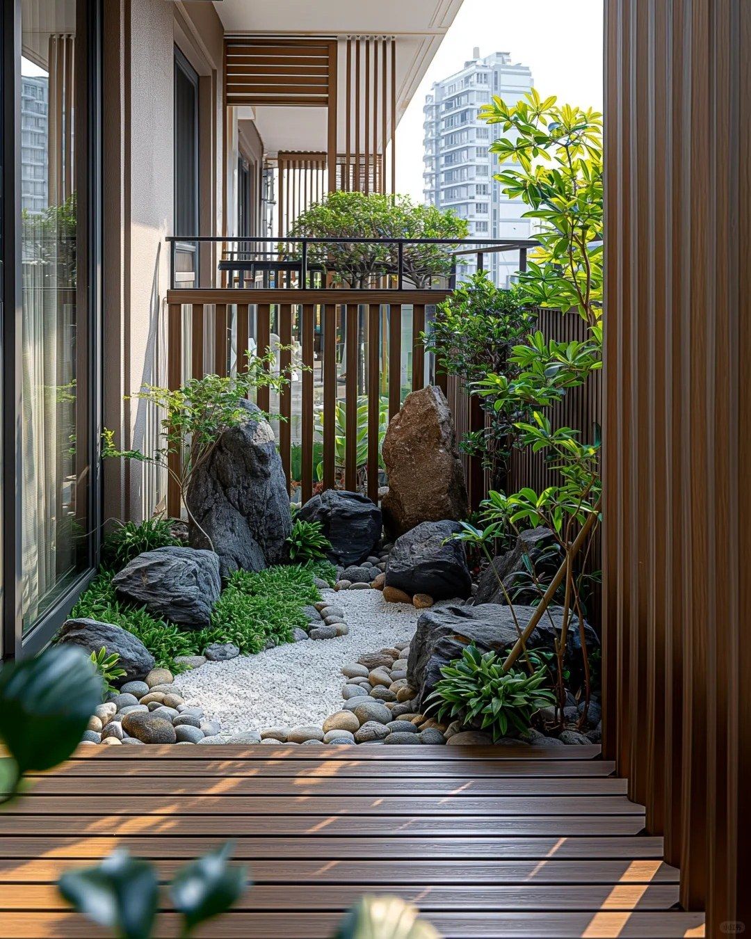 Phong cách Zen (Thiền): Sự kết hợp của đá cuội, sỏi trắng và những khóm trúc nhỏ, tạo không gian tĩnh lặng tuyệt đối để thiền định hoặc tập Yoga.