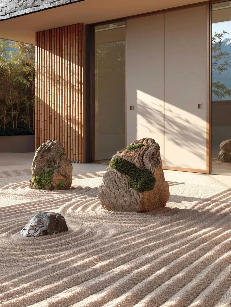 Một khu vườn đá Thiền tông, với những họa tiết cát được cào và những tảng đá được sắp xếp cẩn thận, là minh chứng cho tác động sâu sắc của chủ nghĩa tối giản trong việc tạo nên một không gian ngoài trời thanh bình.