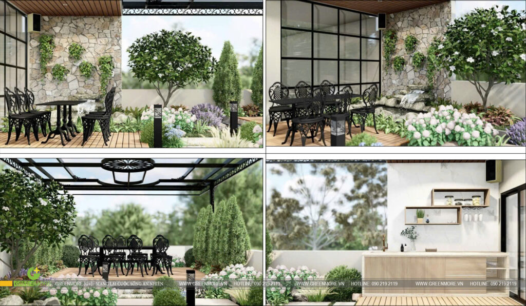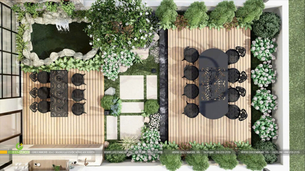 - Đặc điểm: Thiết kế sân vườn trên sân thượng, thiết kế sân thượng 65m2, sân thượng có bể cá, khu ăn uống sân thượng, cải tạo sân thượng, Greenmore