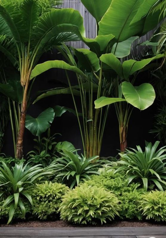 Có thể nói là thiếu sót lớn nếu như không nhắc đến những loại cây làm nổi bật lên phong cách resort nhiệt đới Tropical bởi sự đặc trưng và tính thẩm mỹ của chúng mang lại như: Trầu bà lá xẻ (monstera), Chuối cảnh, Dừa cảnh, Cọ cảnh, Ráy cảnh, Thiên điểu, Dương xỉ… Các loại cây này có sức sống mãnh liệt, phát triển tốt trong môi trường khí hậu như Việt Nam. Là một trong những loại cây được đánh giá cao và được ưu tiên sử dụng.